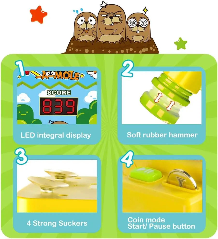 - Interactive Gameplay: Features two hammers that allow kids to hit the moles, enhancing their reflexes and focus.